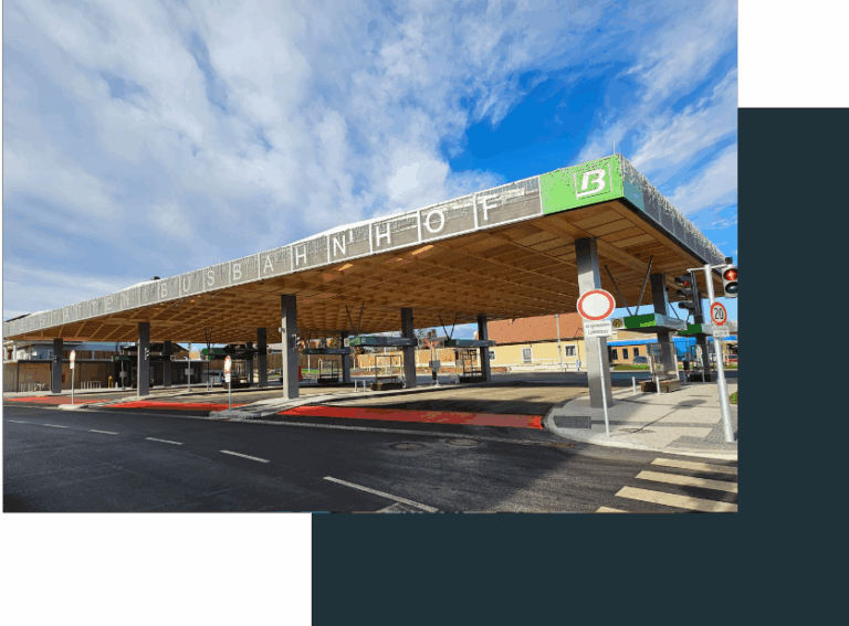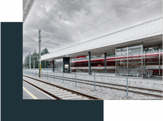 Produkte: Verkleidung Bahnsteigdach, Streckmetalldecke, Fassaden aus Faserzementplatten, Rohrrahmenelemente aus Aluminium, diverse Schlosserarbeiten